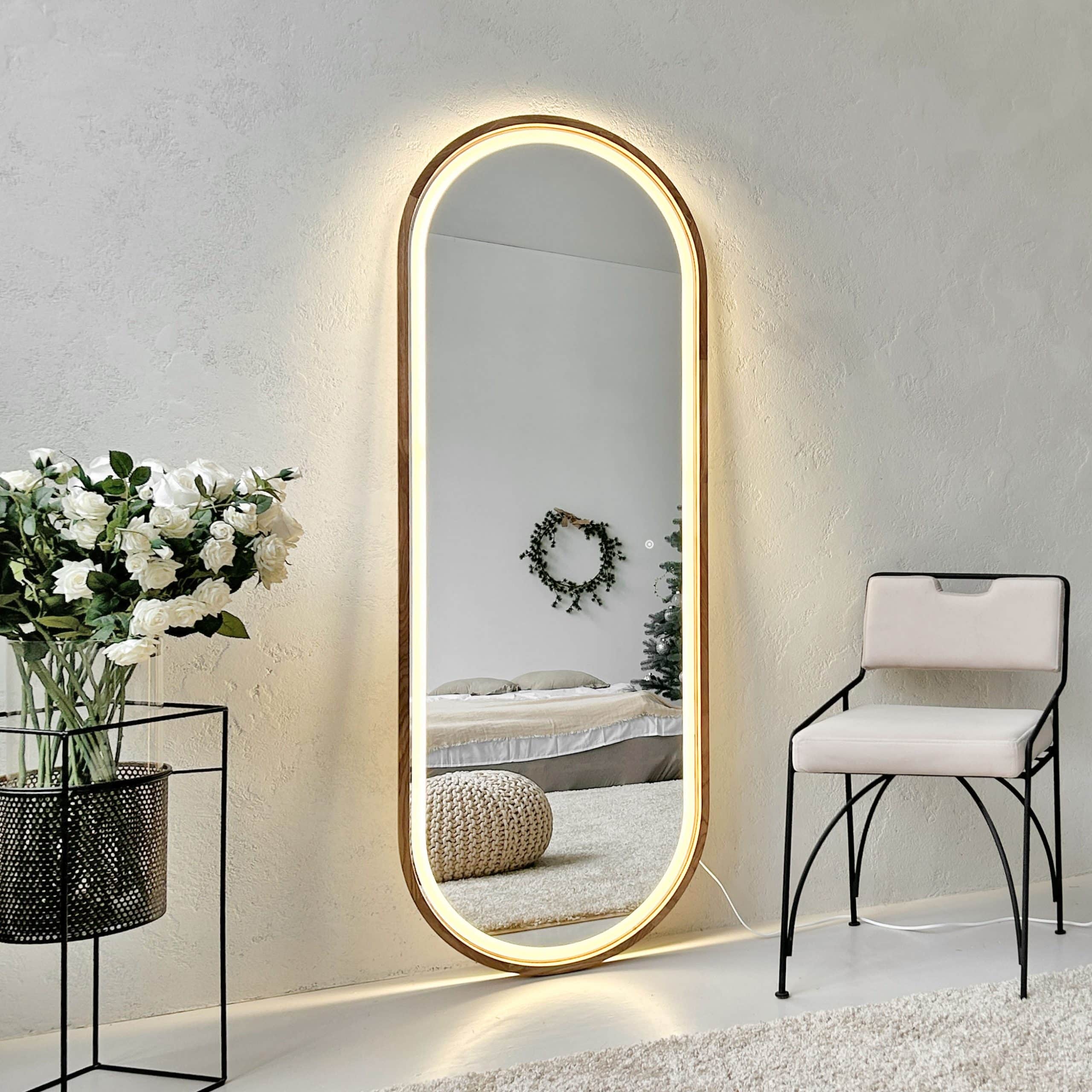 The full-length mirror in a wooden frame with LED backlighting is more than just a mirror—it's a true work of art that becomes an essential part of your style. It offers not only a clear reflection but also creates an atmosphere where you can truly flourish. Every glance into it reveals not just your appearance but your individuality, highlighting every detail of your look. The soft light gently surrounding the mirror adds warmth and tenderness, embracing your reflection and creating a sense of harmony and confidence. With the "WOW effect" that the backlighting provides, your style and appearance become even more expressive.