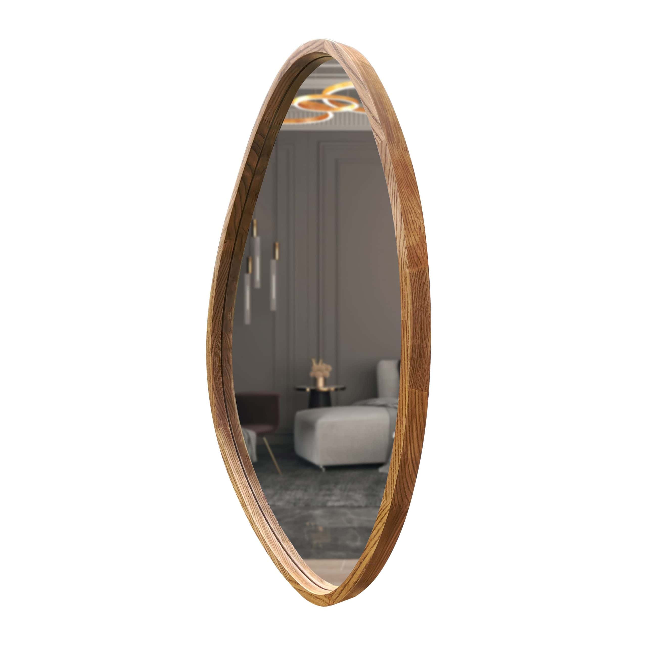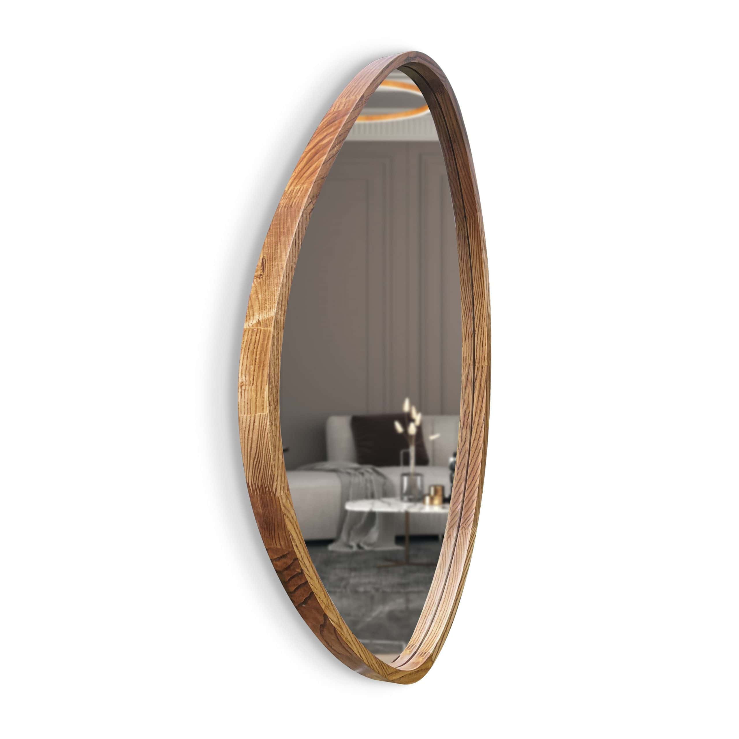 An asymmetrical mirror in a wooden frame is a fusion of natural beauty and artistic elegance. Its unique shape evokes a sense of lightness and movement, as if the natural flow of time comes to life in its reflection. The wooden frame adds warmth, emphasizing the authenticity of the materials and creating harmony between nature and modern interior design. This mirror not only reflects your image but also becomes a refined accent in any room, enhancing its charm and style.