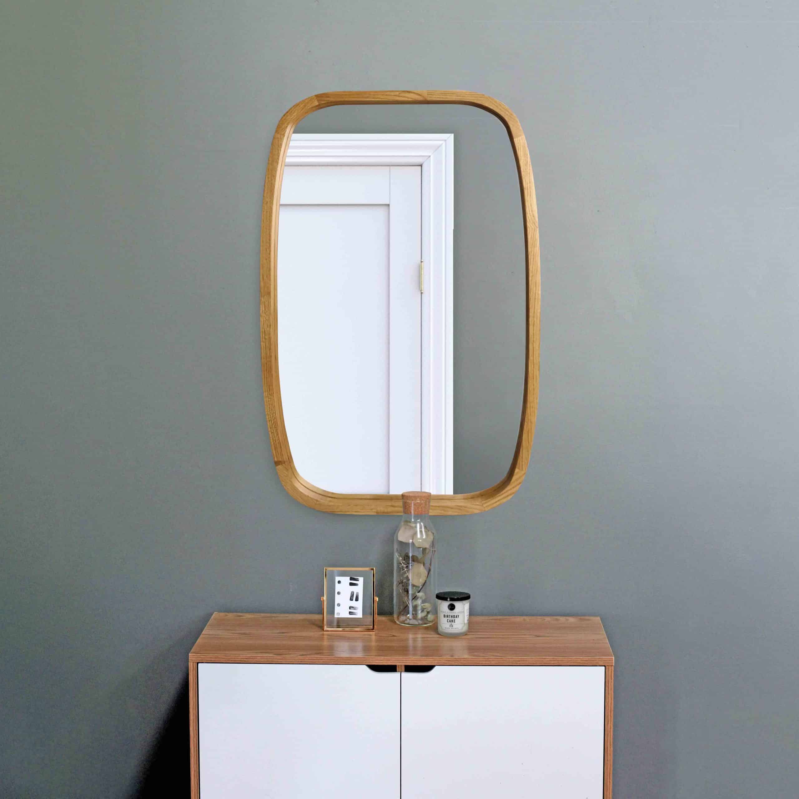 This rectangular mirror with gently rounded corners and a wooden frame is the perfect choice for those seeking refined simplicity and natural beauty. Its understated yet captivating design brings charm and warmth to any room. The frame, crafted from natural wood, adds harmony and organic style to your space, reflecting your attention to detail and desire to surround yourself with the finest elements.