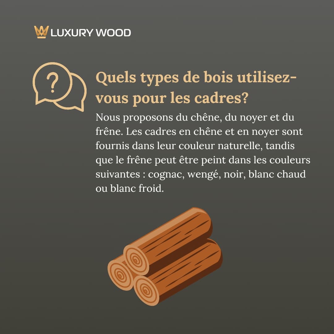 Nous proposons du chêne, du noyer et du frêne. Les cadres en chêne et en noyer sont en couleur naturelle, tandis que le frêne peut être peint en cognac, wengé, noir, blanc chaud ou froid.