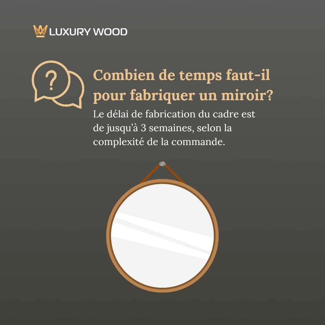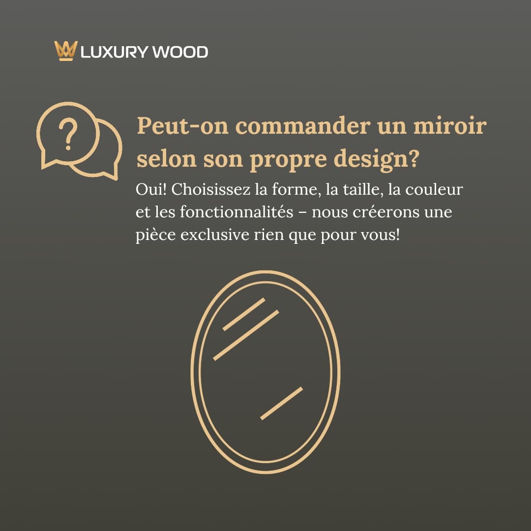 Oui! Nous créons des miroirs selon des projets individuels. Vous pouvez choisir la forme, la taille, le type de bois, la couleur du cadre et des fonctionnalités supplémentaires, telles que l’éclairage.