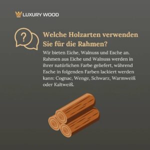 Wir bieten unseren Kunden Eiche, Walnuss und Esche. Eichen- und Nussbaumrahmen kommen in ihrer natürlichen Farbe, während Esche in Cognac, Wenge, Schwarz, warmem oder kaltem Weiß lackiert werden kann.