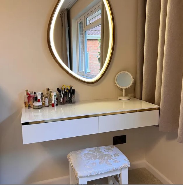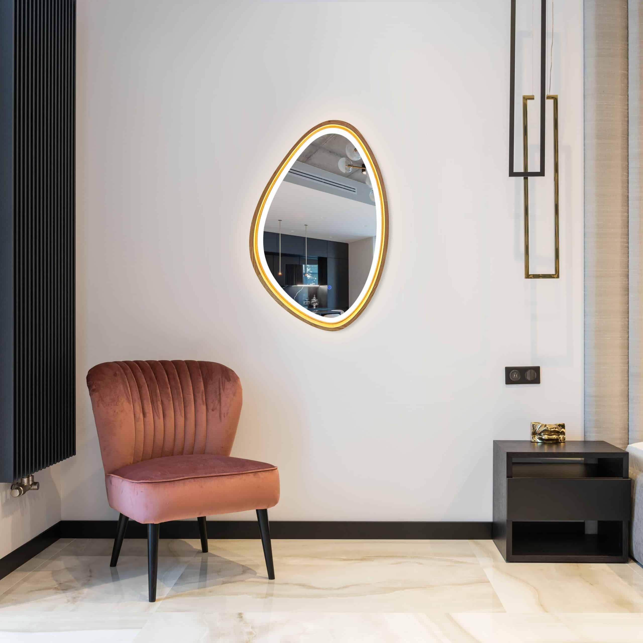 - Lichtakzent – Die LED-Beleuchtung betont nicht nur die Form des Spiegels, sondern setzt auch einen feinen Lichtakzent und macht ihn zu einem zentralen Highlight im Raum.