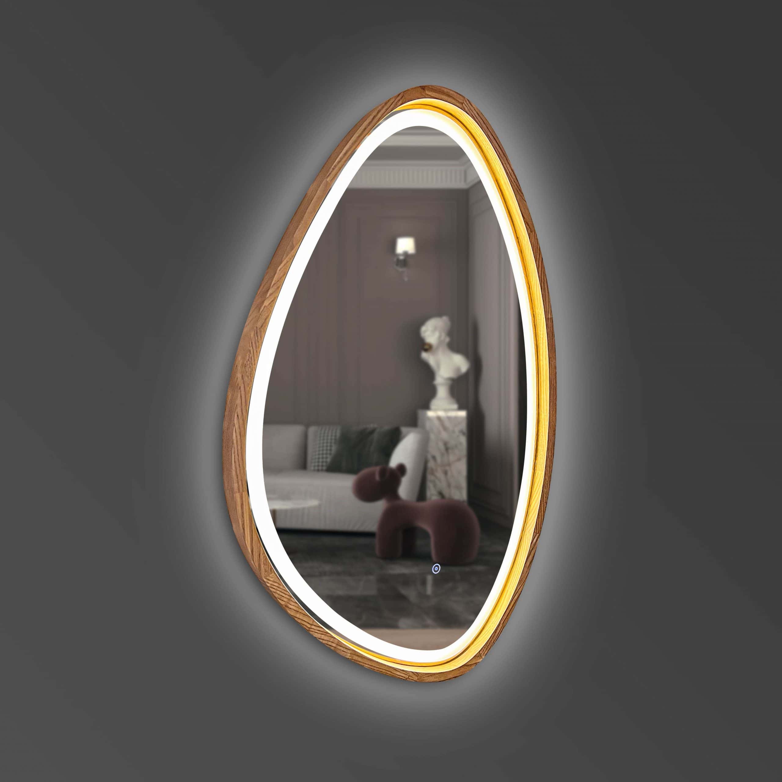 Ein asymmetrischer Spiegel in einem Holzrahmen mit LED-Beleuchtung ist eine Kombination aus natürlicher Schönheit, künstlerischer Eleganz und moderner Technologie. Seine einzigartige Form vermittelt ein Gefühl von Leichtigkeit und Bewegung, als würde der Fluss der Zeit im Spiegelbild zum Leben erweckt. Der Holzrahmen unterstreicht die Authentizität der Materialien und verleiht dem Spiegel Wärme und Harmonie mit der Natur. Die LED-Beleuchtung verbreitet sanftes Licht, umhüllt den Raum mit einem weichen Schein und sorgt für Komfort und eine unverwechselbare Atmosphäre.