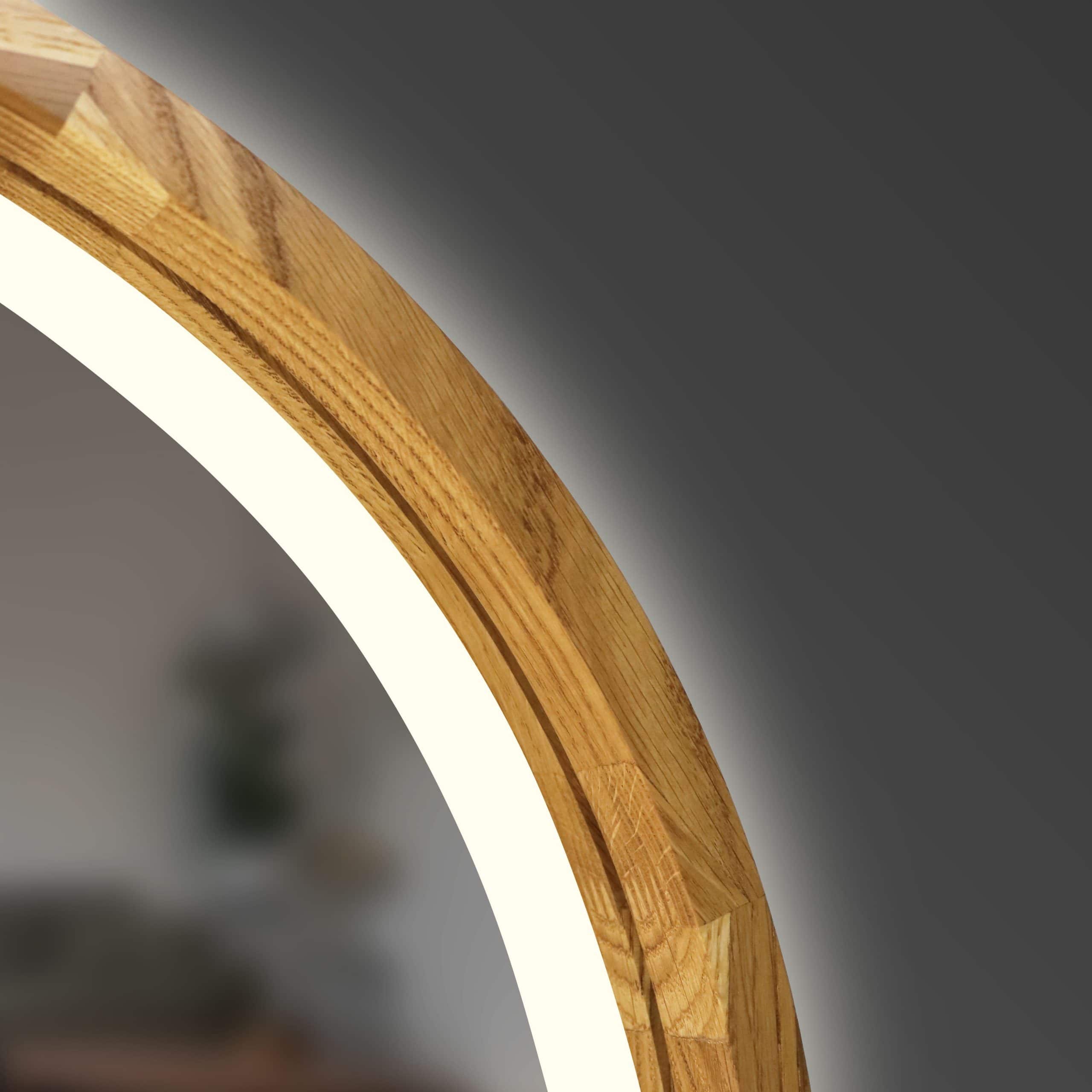 Der Rahmen ist aus natürlichem Holz gefertigt und betont die Schönheit des Materials. Jedes Stück ist einzigartig aufgrund seiner natürlichen Maserung. Dank seiner abgerundeten Form und dem warmen Licht der LED-Beleuchtung füllt dieser Spiegel Ihr Interieur mit sanftem Licht und Komfort und schafft eine Atmosphäre von Luxus und Gemütlichkeit.