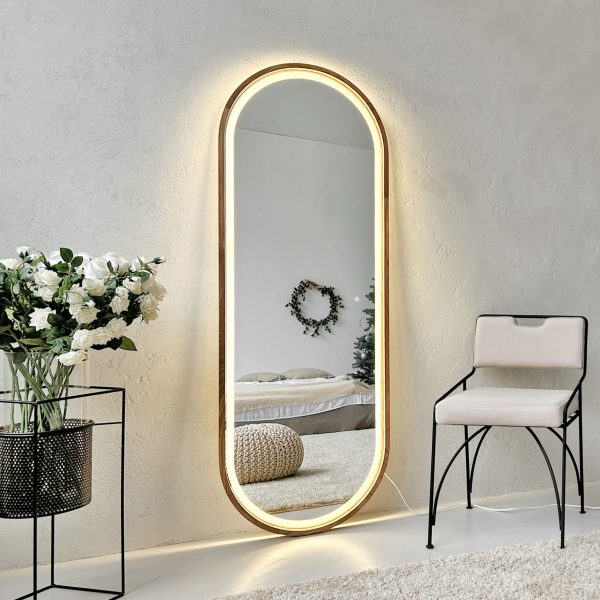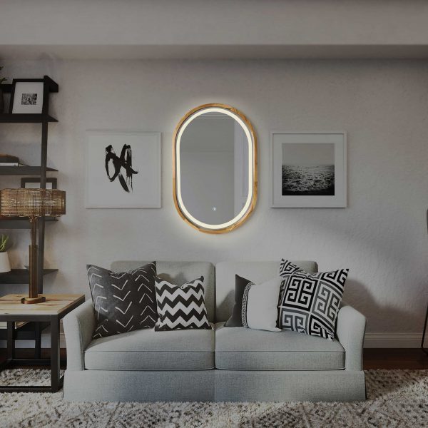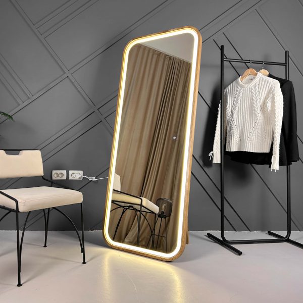 Wir verwenden hochwertige LED-Komponenten, um eine lange Lebensdauer zu gewährleisten. Die Beleuchtung dieses Spiegelmodells ist frontseitig, was eine angenehme Beleuchtung im Raum hinzufügt und hilft, die Reflexionen besser zu sehen. Das Licht breitet sich direkt aus, indem es sich von dem Holzrahmen reflektiert, was einen besonderen Effekt hinzufügt, da das Holz seine Wärme und Schönheit überträgt! Der Touch-Schalter ermöglicht es Ihnen, die Helligkeit einzustellen und ist in zwei Varianten erhältlich: berührungsempfindlich oder kontaktlos, aktiviert durch Handbewegungen.