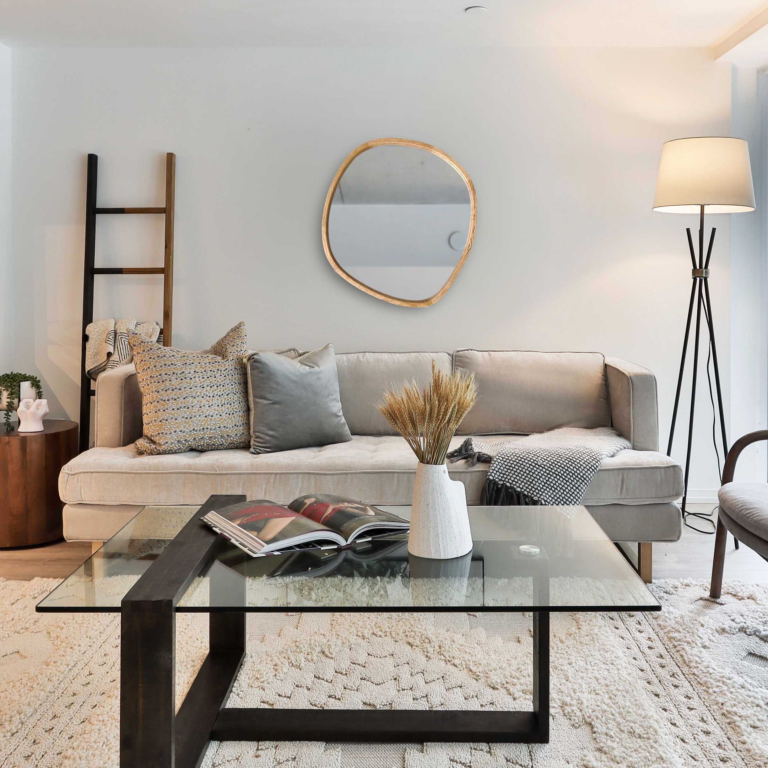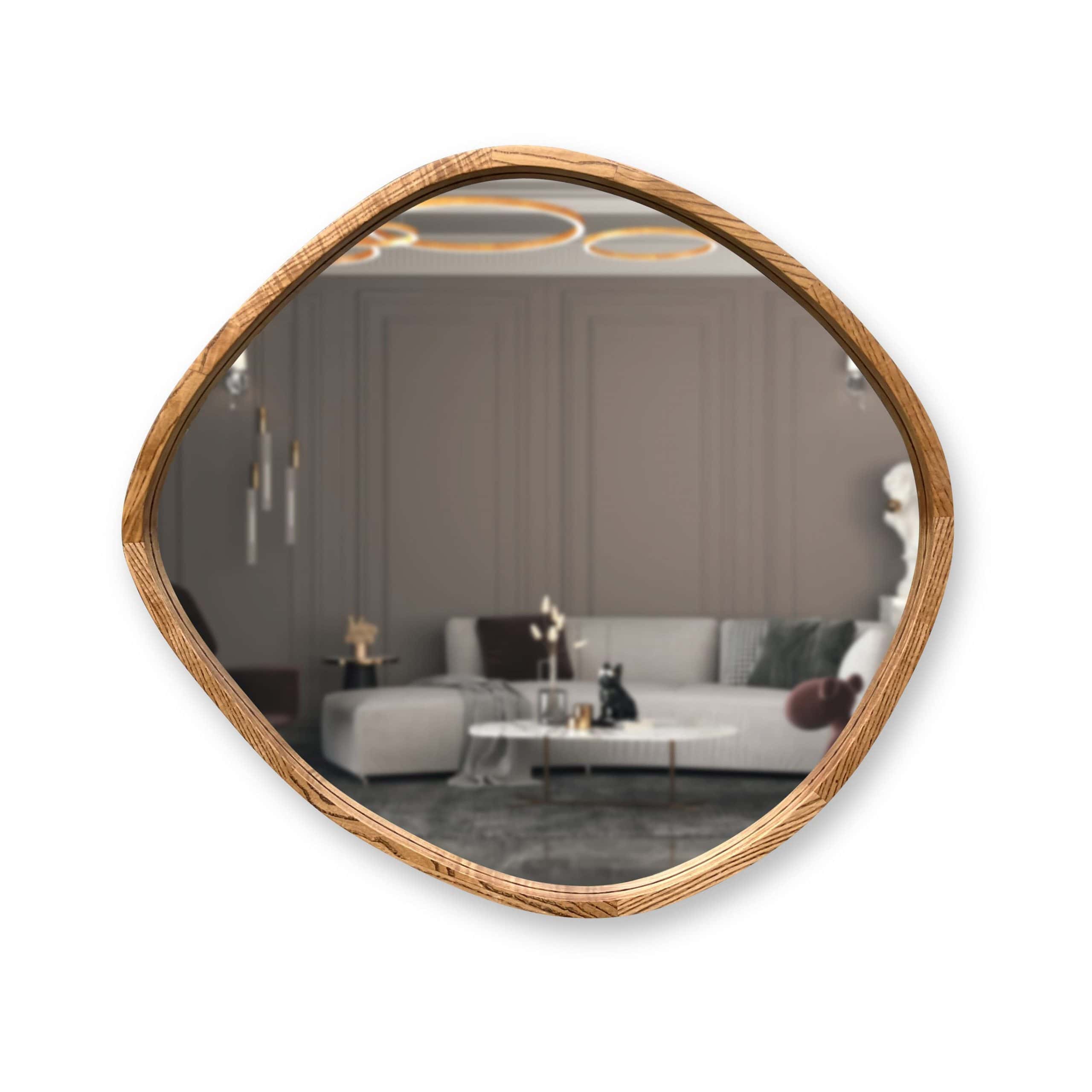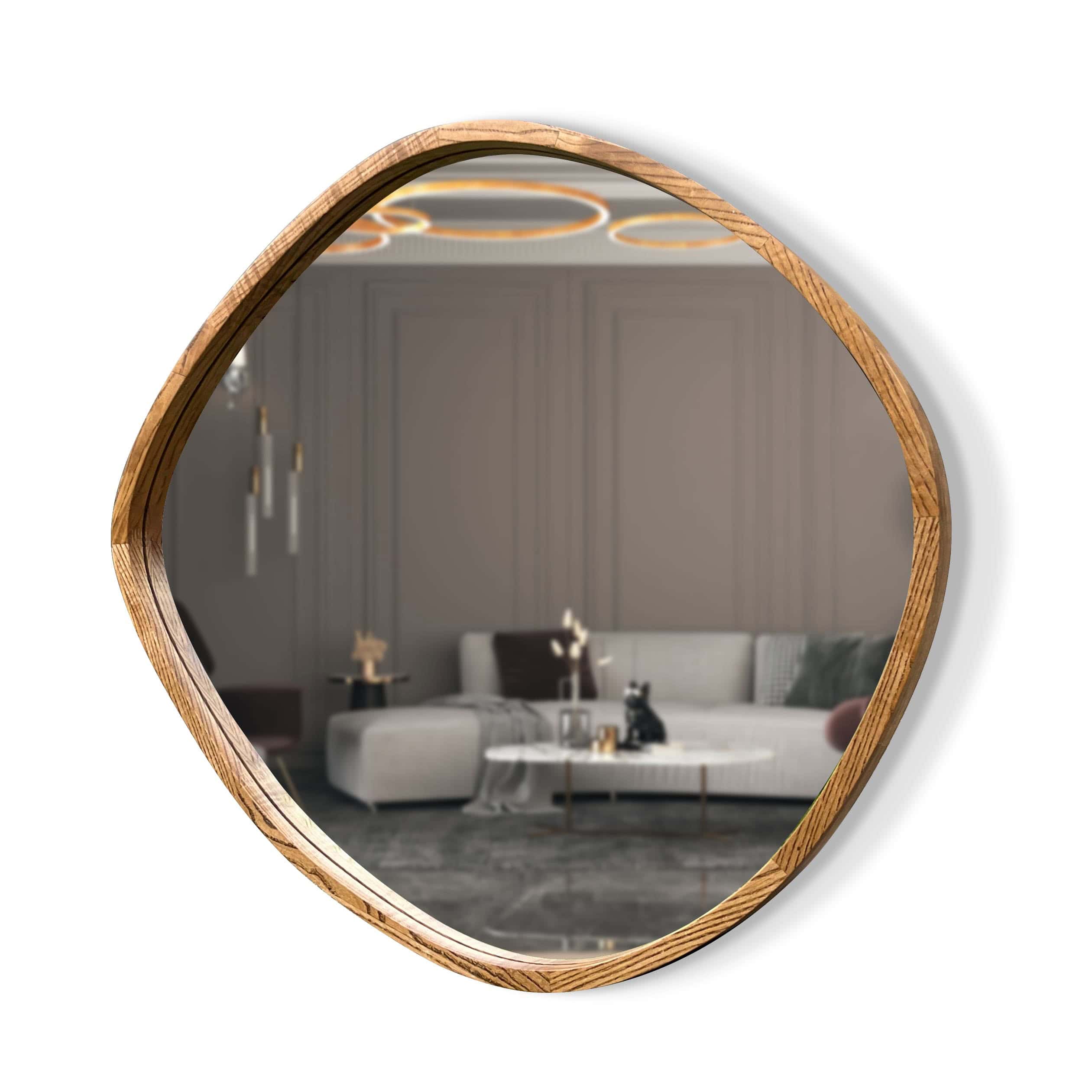Ein asymmetrischer Spiegel in einem Holzrahmen ist eine Kombination aus natürlicher Schönheit und künstlerischer Eleganz. Seine einzigartige Form vermittelt ein Gefühl von Leichtigkeit und Bewegung, als würde der natürliche Fluss der Zeit im Spiegelbild zum Leben erweckt. Der Holzrahmen verleiht dem Spiegel Wärme und unterstreicht die Natürlichkeit der Materialien, wodurch eine harmonische Verbindung zwischen Natur und modernem Interieur entsteht. Dieser Spiegel reflektiert nicht nur Ihr Bild, sondern wird auch zu einem raffinierten Blickfang in jedem Raum, der Charme und Stil verleiht.
