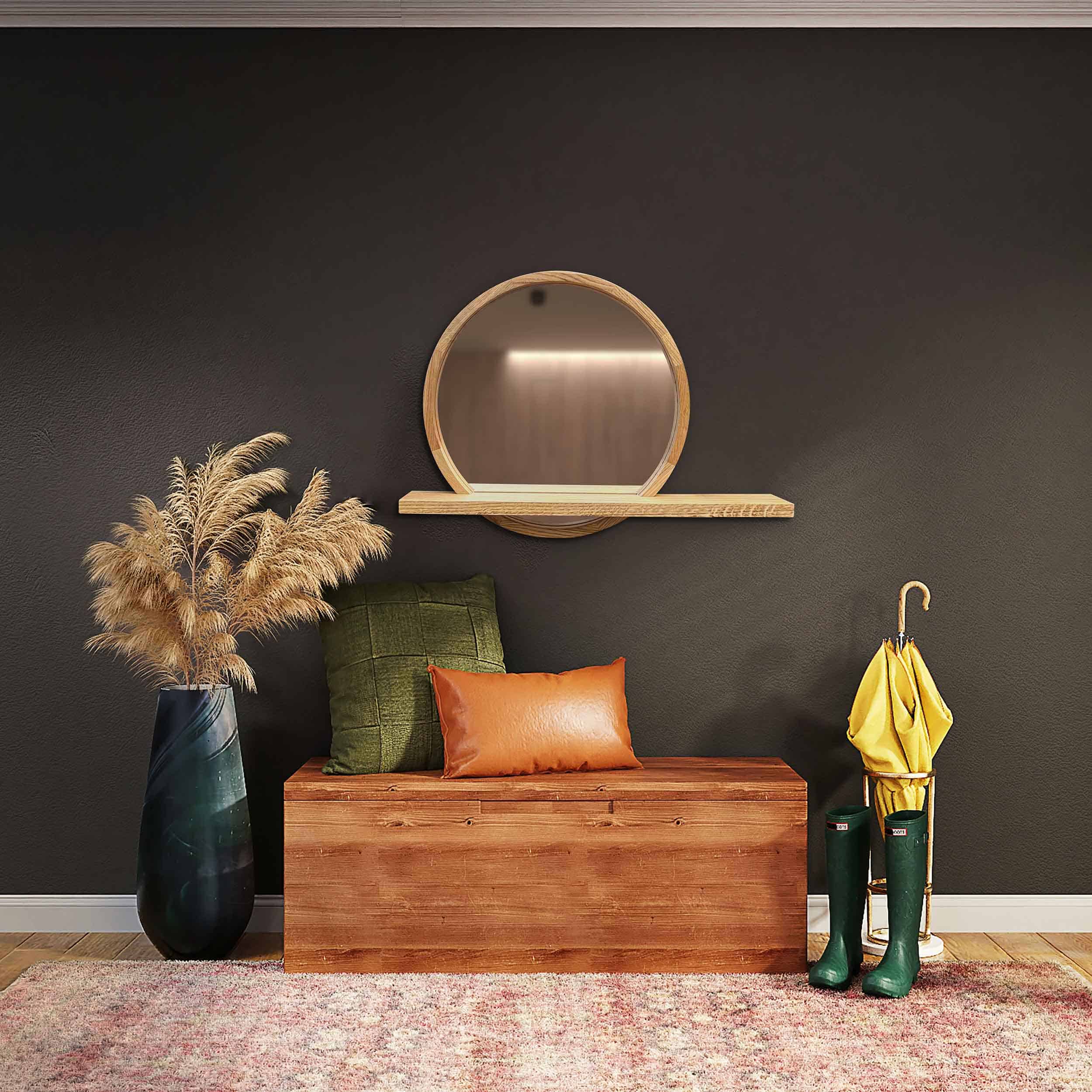 Im Spiegelbild Ihrer einzigartigen Schönheit liegt ein Spiegel mit Holzrahmen, der eine besondere Atmosphäre der Gemütlichkeit schafft. Dieses elegante Element schmückt nicht nur Ihren Raum, sondern lädt auch sanfte Sonnenstrahlen ein, auf seiner glatten Oberfläche zu tanzen. Der Spiegel mit Regal wird zum stillen Zeugen Ihrer täglichen Inspiration und bietet Platz für Ihre liebsten Kleinigkeiten. Er absorbiert das Licht des Raumes und verstreut es in einem magischen Glanz, der Ihr Interieur mit Harmonie und Wärme erfüllt.